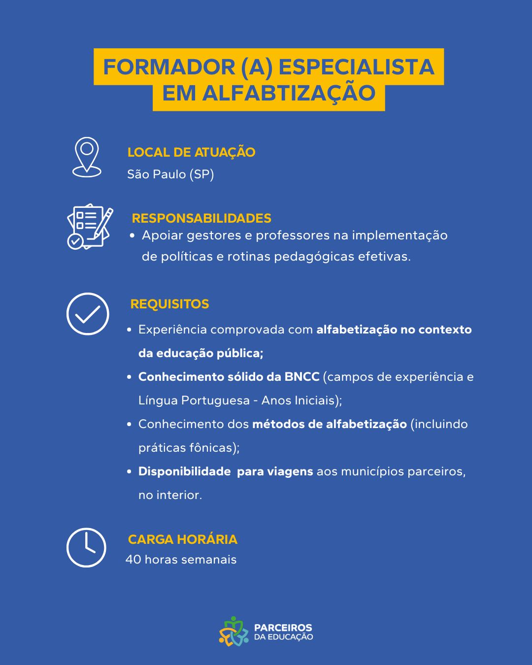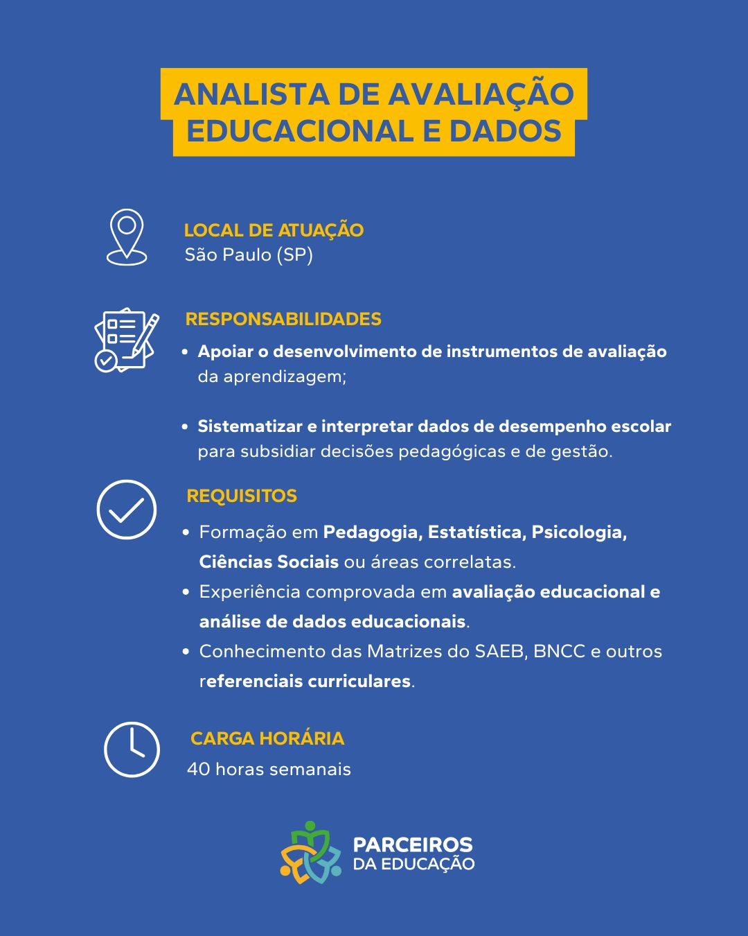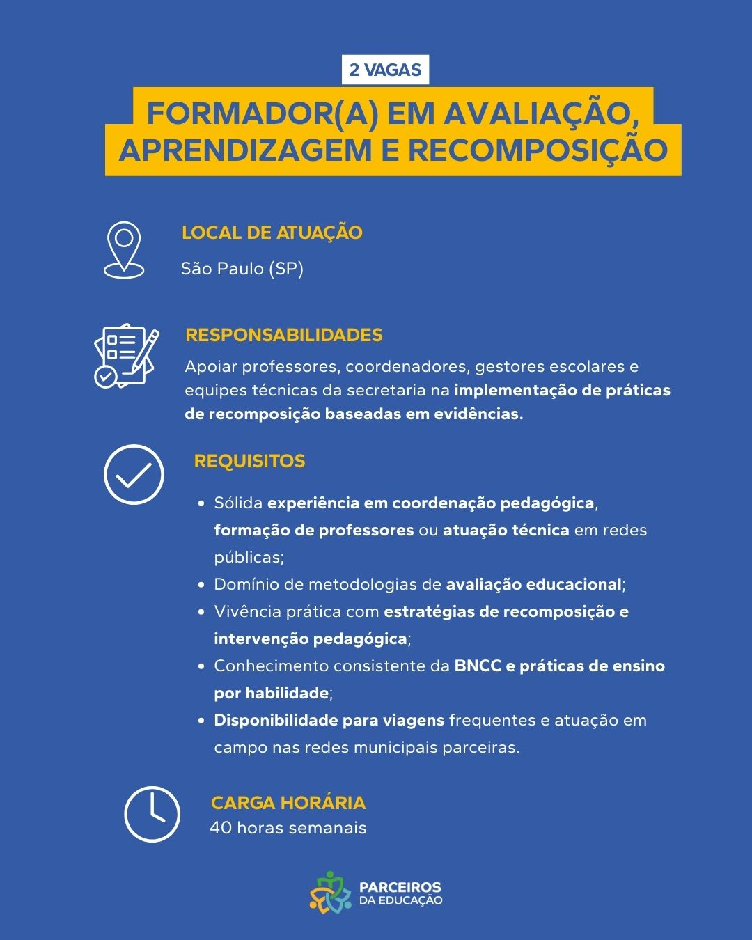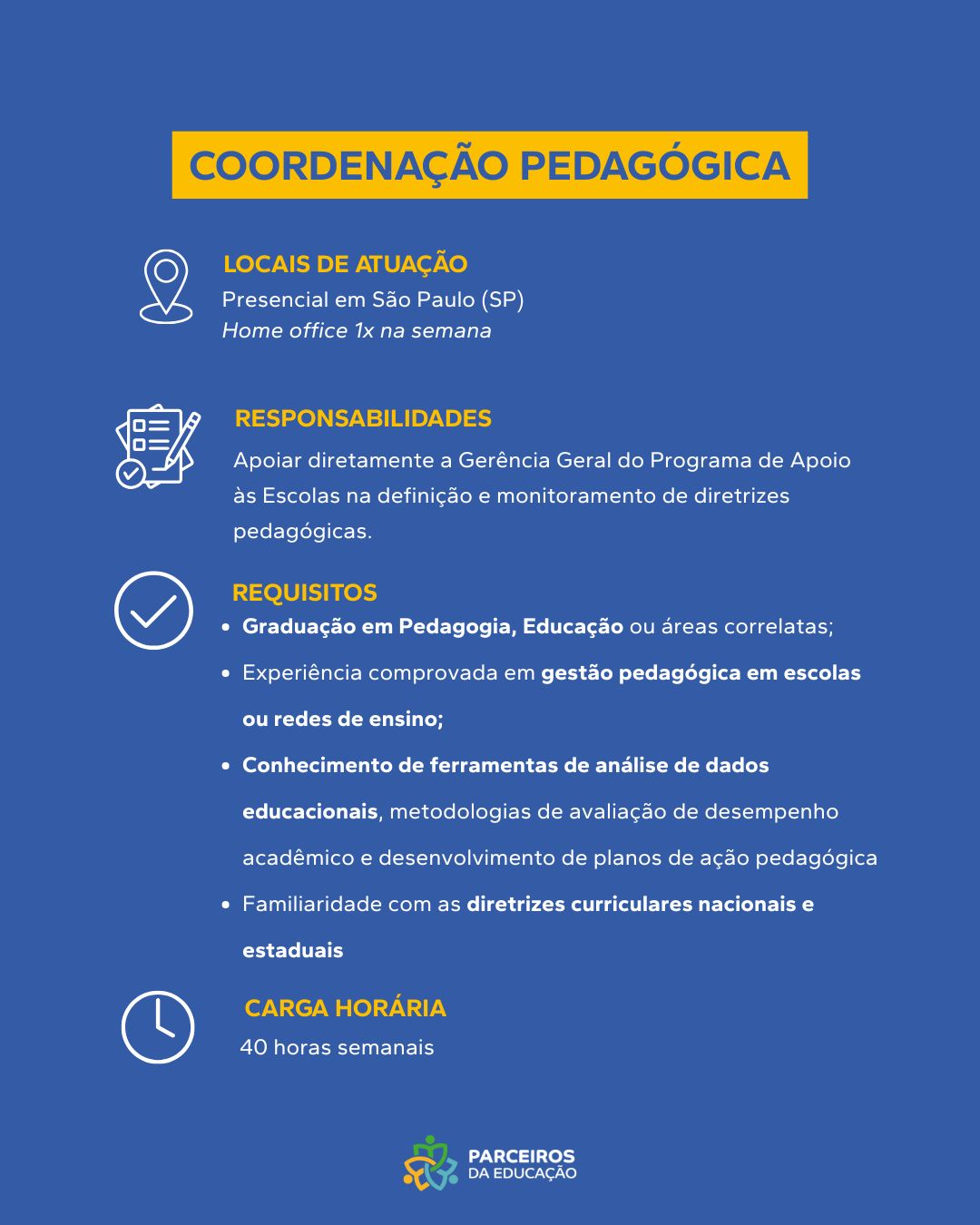 Sobre a Vaga Apoiar diretamente a Gerência Geral do Programa de Apoio às Escolas na definição e monitoramento de diretrizes pedagógicas. Requisitos Obrigatórios Graduação em Pedagogia, Educação ou áreas correlatas; Experiência comprovada em gestão pedagógica [...]