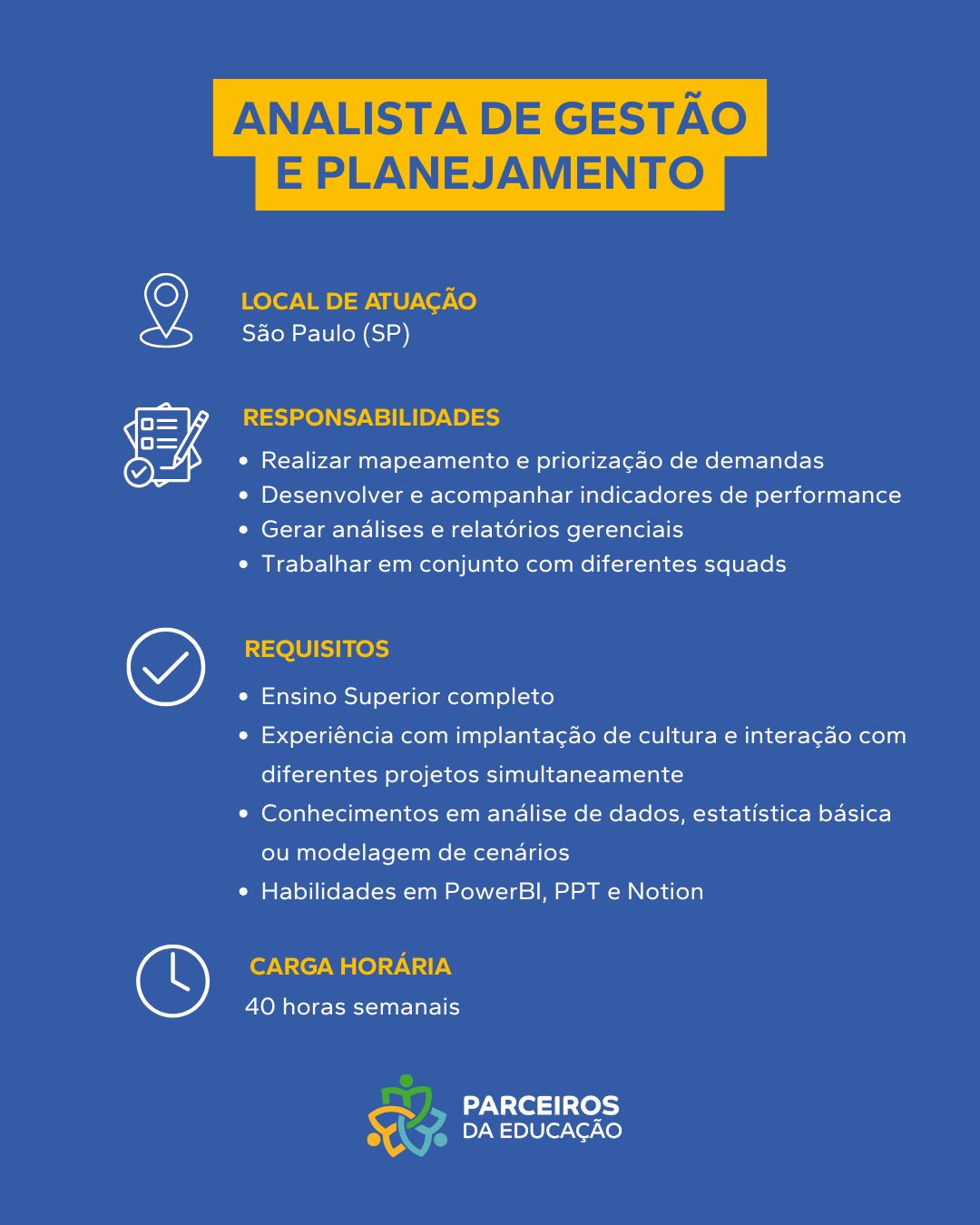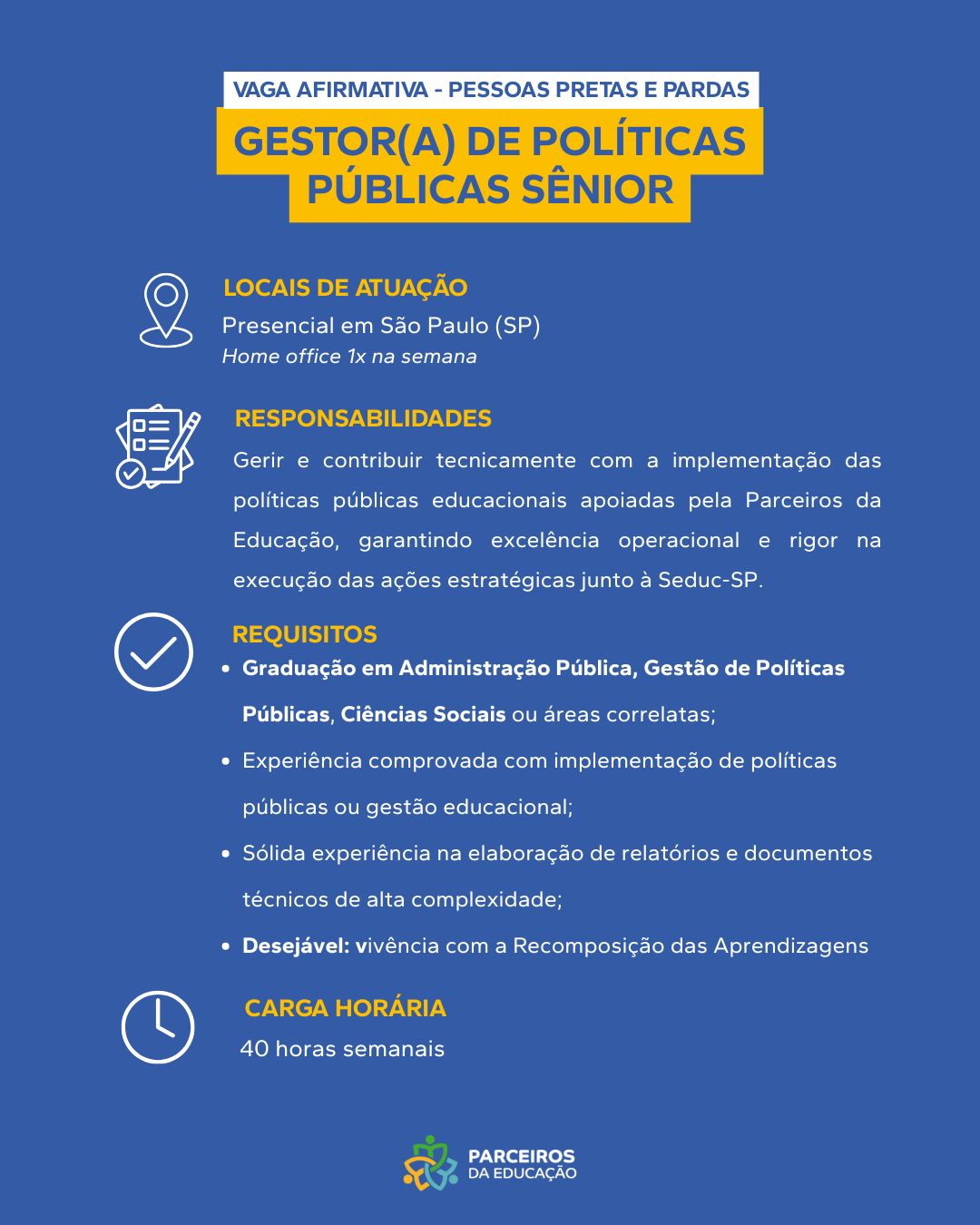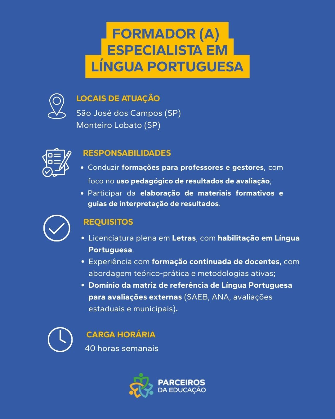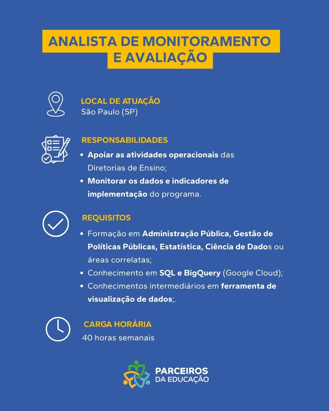 Sobre a Vaga Apoiar diretamente a Gerência Geral do Programa de Apoio às Escolas na definição e monitoramento de diretrizes pedagógicas. Requisitos Obrigatórios Graduação em Pedagogia, Educação ou áreas correlatas; Experiência comprovada em gestão pedagógica [...]