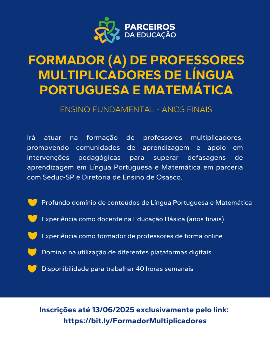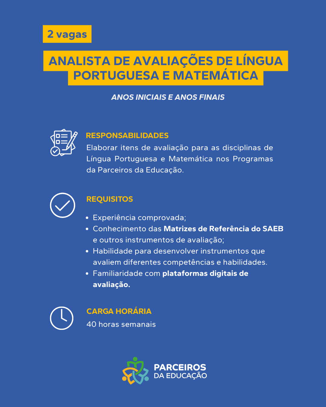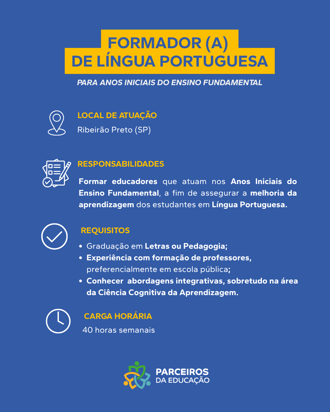 Sobre a Vaga Atuará como Professor(a) de Língua Portuguesa nos Anos Finais e Ensino Médio atuando diretamente com estudantes na recomposição da aprendizagem, incentivando-os a desenvolver habilidades, conhecimentos e competências. Principais Responsabilidades Planejar, aplicar e [...]