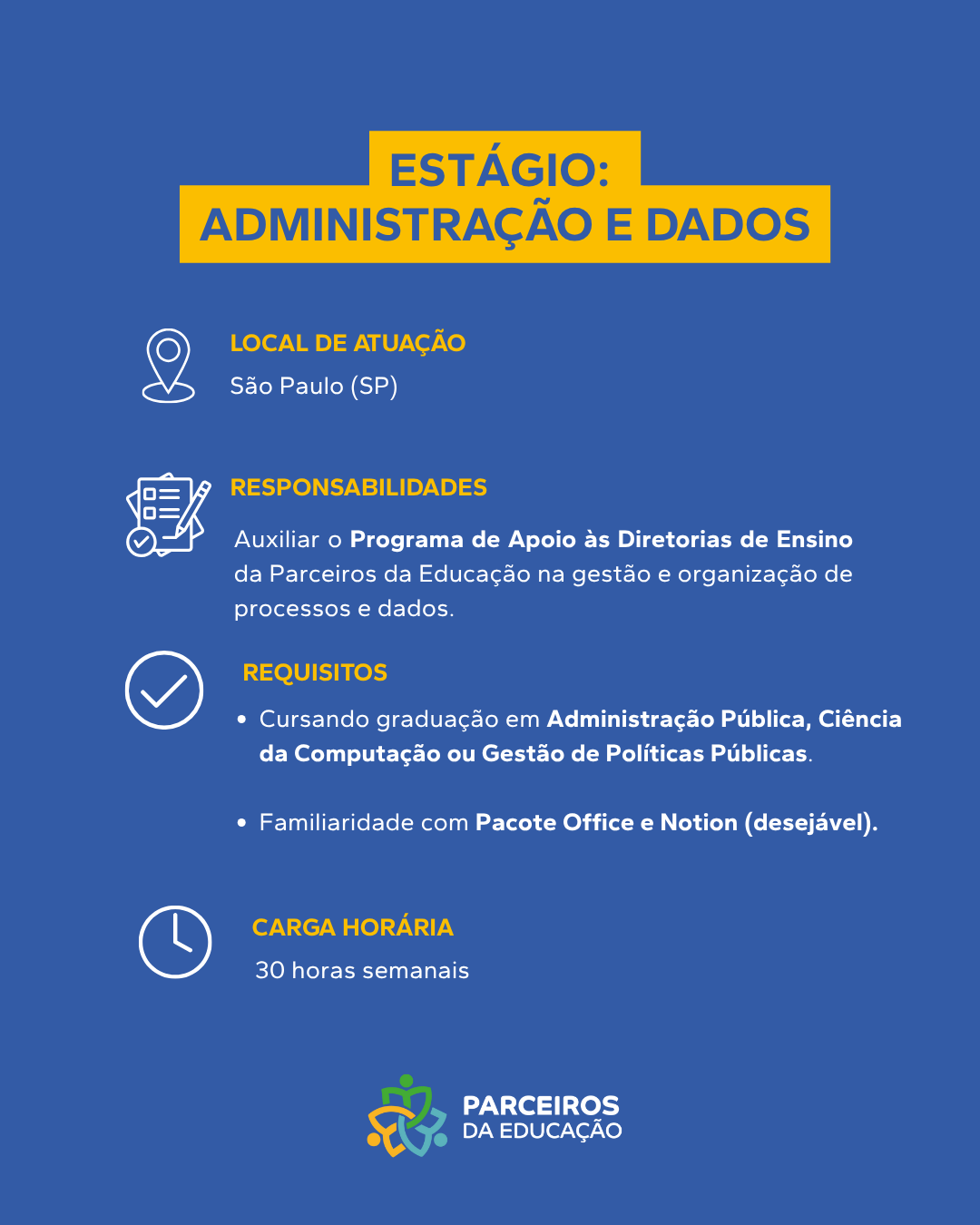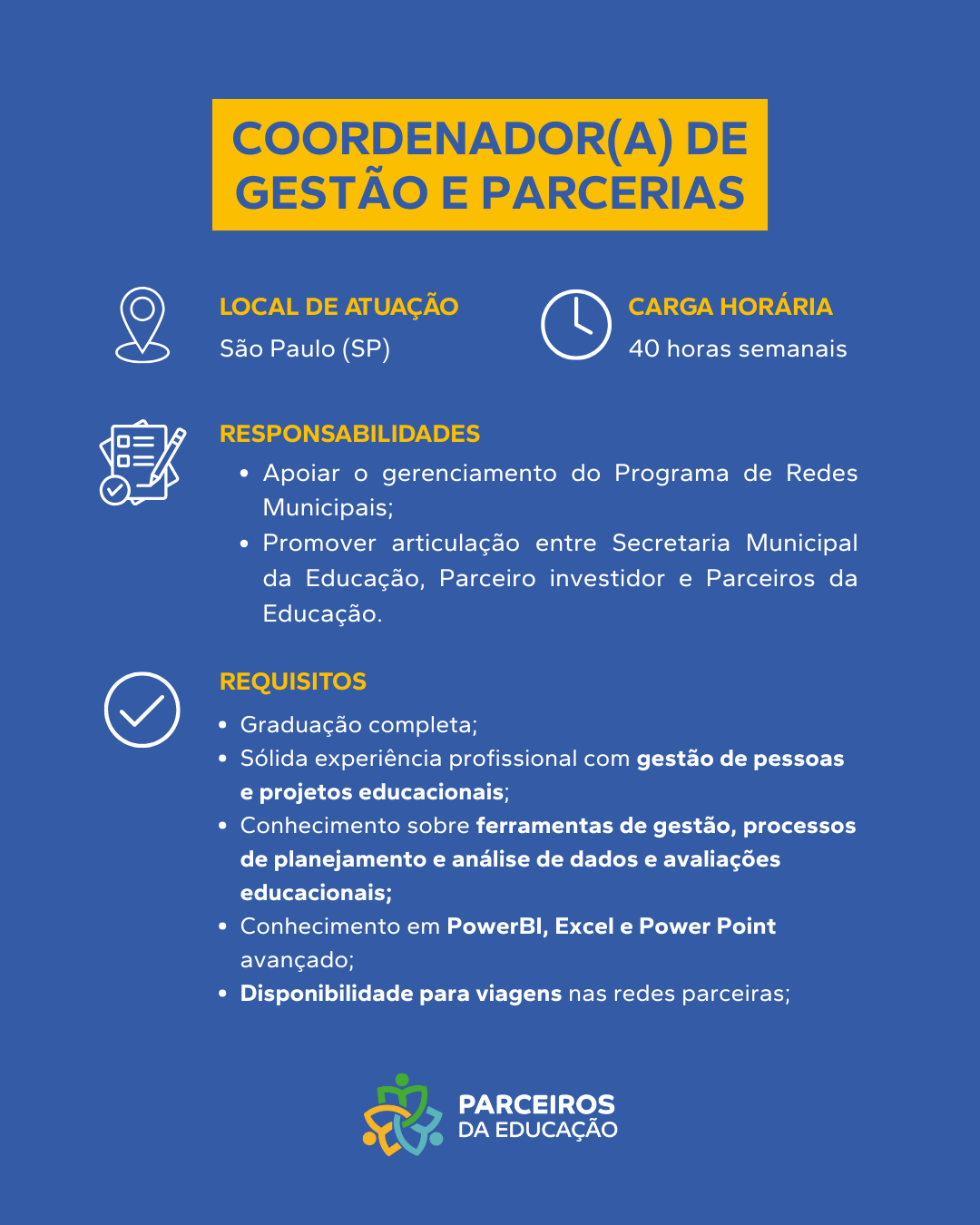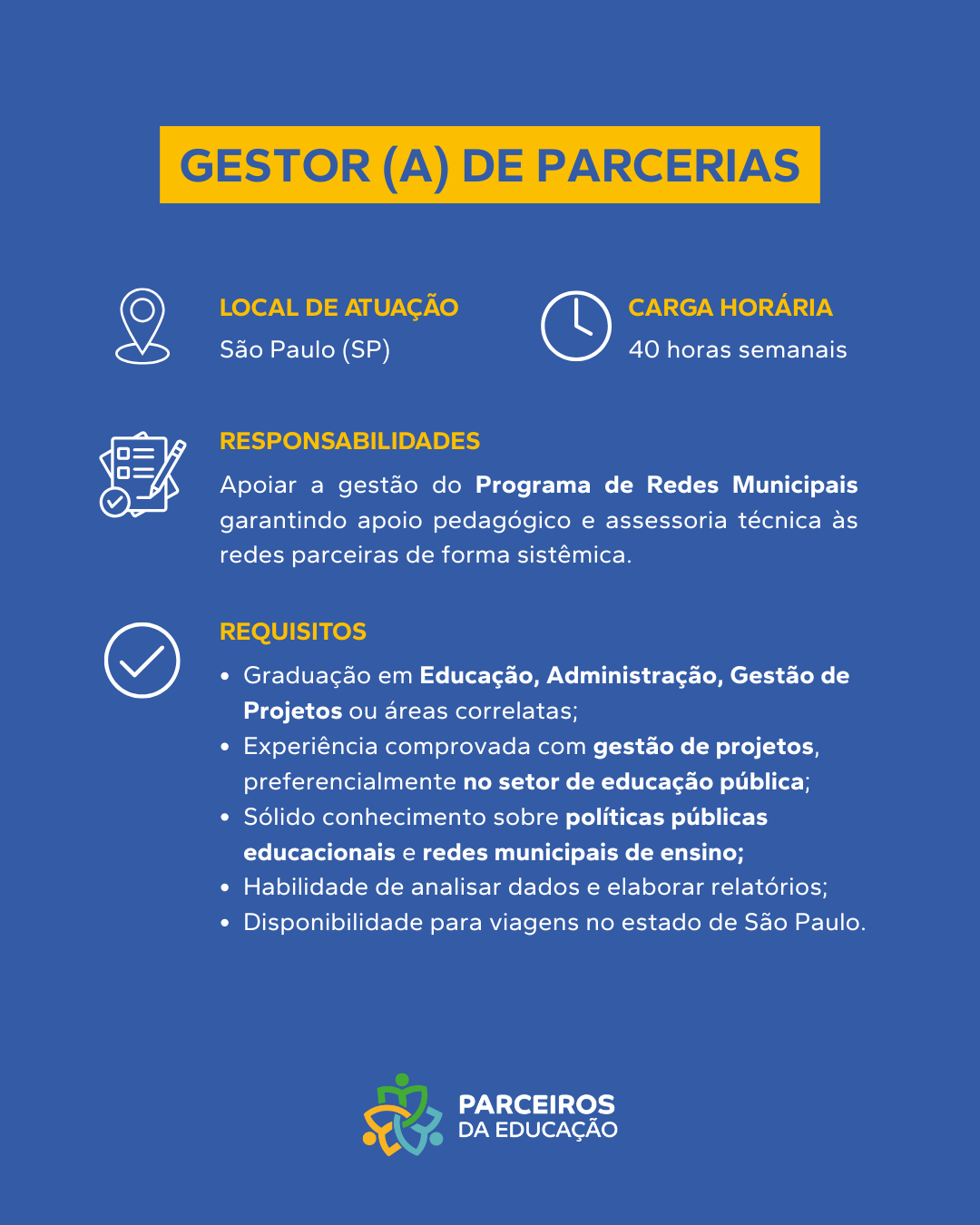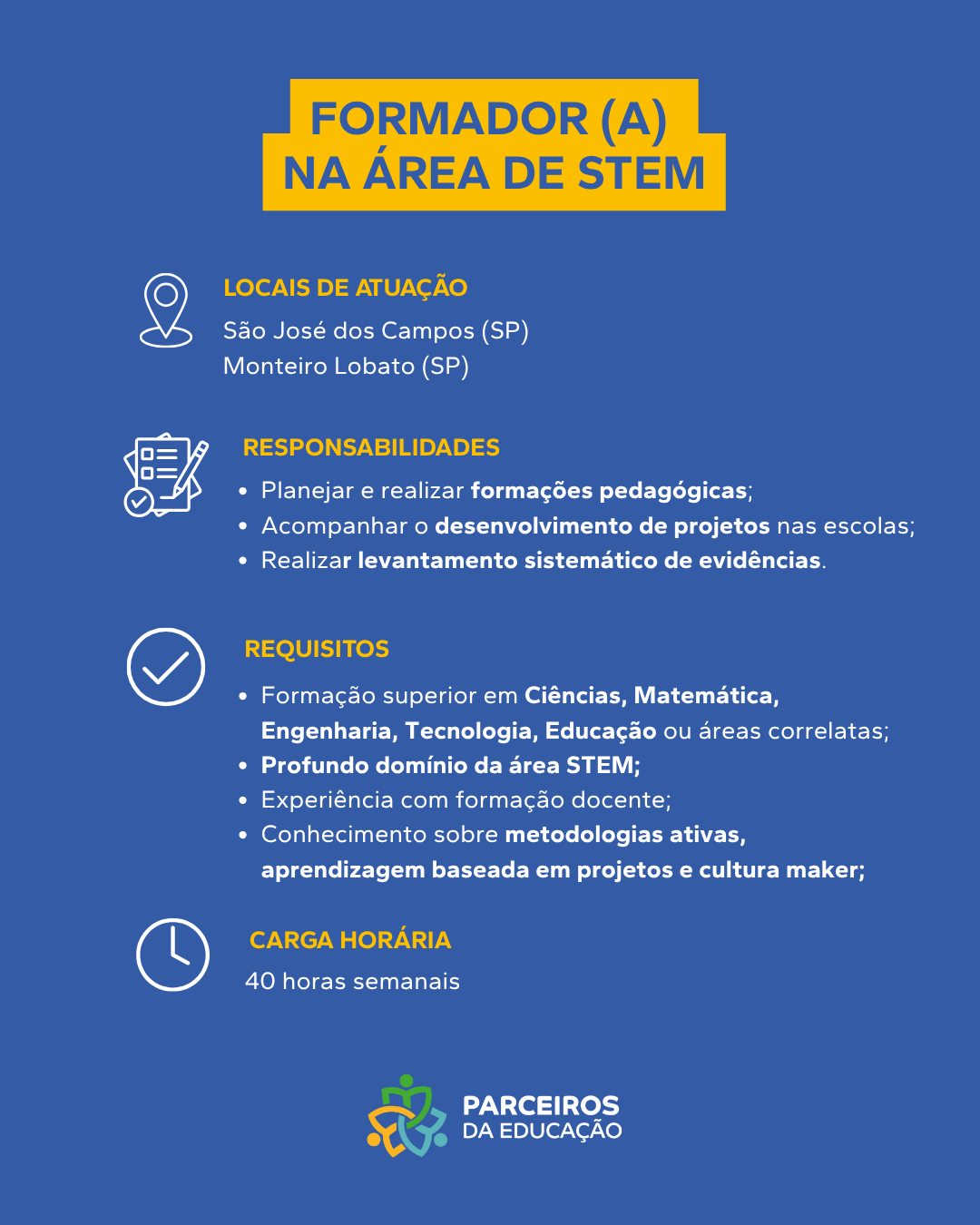 Sobre a Vaga Atuará como Professor(a) de Língua Portuguesa nos Anos Finais e Ensino Médio atuando diretamente com estudantes na recomposição da aprendizagem, incentivando-os a desenvolver habilidades, conhecimentos e competências. Principais Responsabilidades Planejar, aplicar e [...]